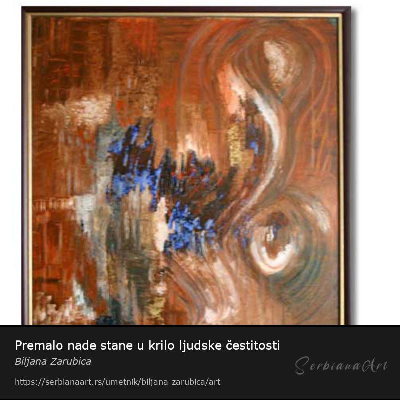 www.slika-ulje2005.comtel: +381(0)32 341 980GSM: +381(0)63 742 77 63Imam jednu vrstu sopstvene jasnoće i sreće koju sam samo ja mogla da prepoznam kod sebe. Za mene svako izgovoreno slovo i njime sklopljena reč ima određenu boju, ta boja nikad nije sama i nikad nije ista baš kao ni slovo u reči već se stalno međusobno prepliću, tako sam osetila da pored pisanog iskaza o nečemu to isto mogu da oslikam rukopisom boja i da se ta dva rukopisa slože i budu...