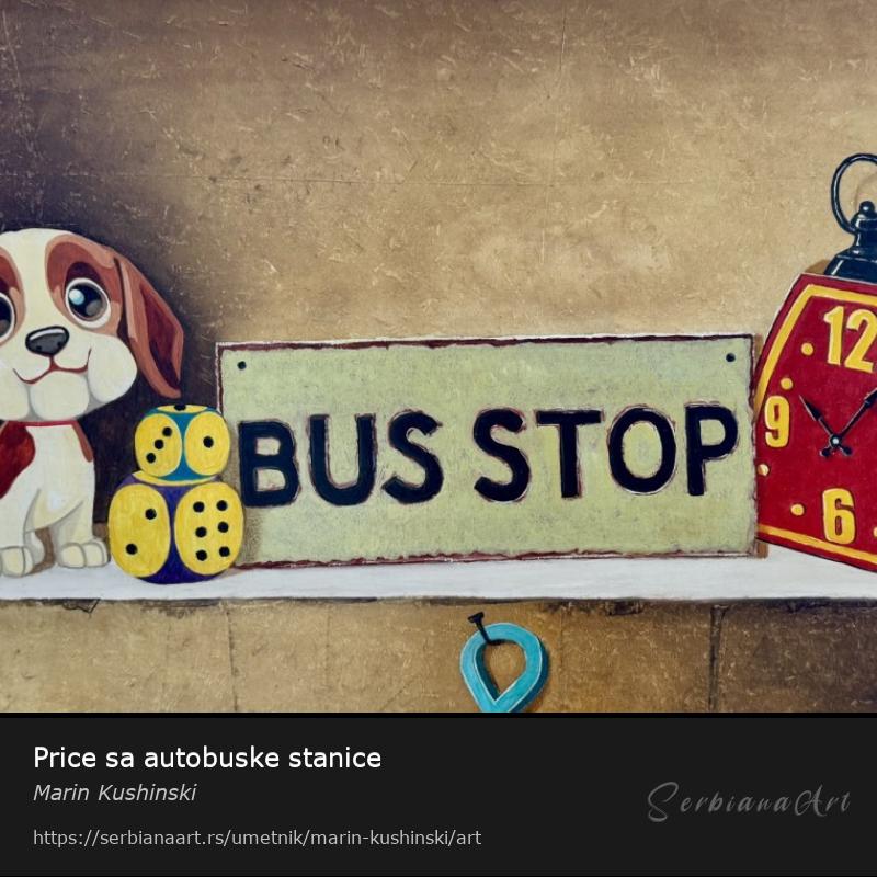 Ova slika, rađena tehnikom ulje na platnu, nosi naziv “Priče sa autobuske stanice.” Prikazuje razigranu i nostalgičnu mrtvu prirodu. Kompozicija uključuje figuru šteneta sa velikim, izražajnim očima sa leve strane, naslagane žuto-plave kockice u centru i starinski znak “BUS STOP” koji zauzima centralno mesto. Desno se nalazi retro-stil crveni sat, koji unosi dozu bezvremenosti u delo. Ispod kompozicije, tirkizni simbol “&” istaknut je i metaforički povezuje elemente slike. Topli tonovi bež i braon pozadine doprinose razigranom, ali i sentimentalnom karakteru slike, simbolizujući trenutke čekanja, povezivanja i dečije čarolije.
