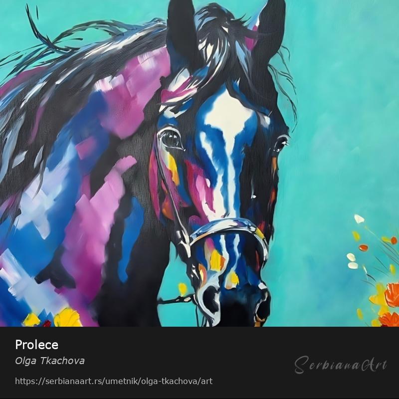 Ова динамична уљана слика је прослава слободе, енергије и бескрајне креативности. На нежној плавој позадини која евоцира отворено небо и бескрајни простор, величанствено стоји разнобојни коњ – његова силуета пулсира животом, исткана живописним потезима четкице и богатим нијансама боја.