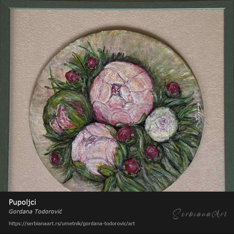 Moja inspiracija je budjenje i radjanje od pupoljaka do cveca.Slika je radjena na kruznom platnu sa lepim ramom.Original i rucno radjena slika.