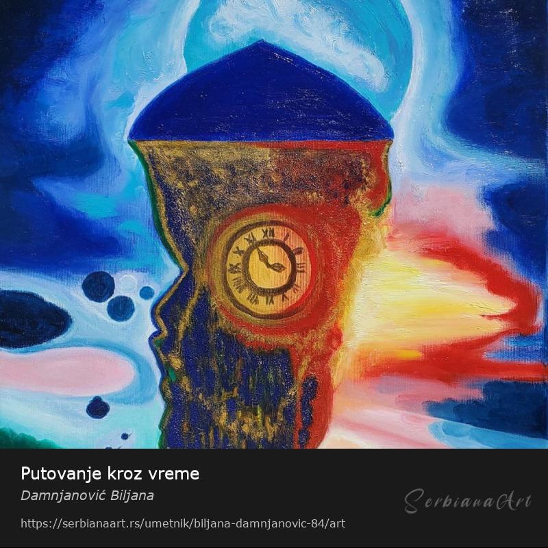 Slika ``Putovanje kroz vreme`` je moja lična avantura idoživljaj vremena i putovanja u budućnosti kroz moje snove. Sat metaforički pokazuje da polako ističe vreme za život. Vatra se već pojavila. Kada se budu poklopile kazaljke to će biti kraj neobičnog sredstva za put i njihovih putnika.Vreme je beskonačno, ali ne i put i život.