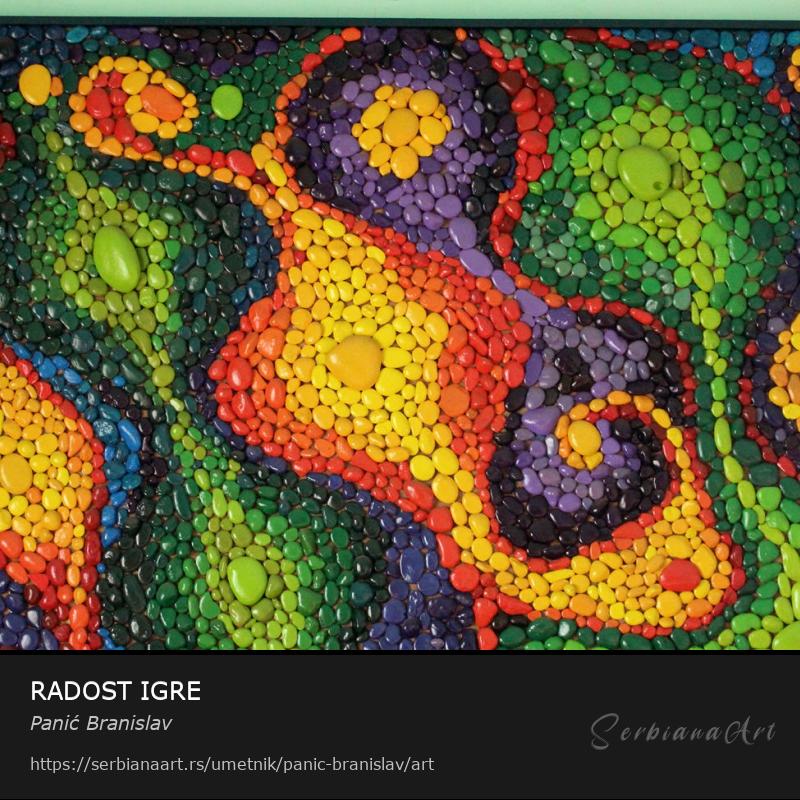 Radjen je tehnikom lepljenja sitnih obojenih oblutaka na sper plocu.Podelite i promovišite ovo delo