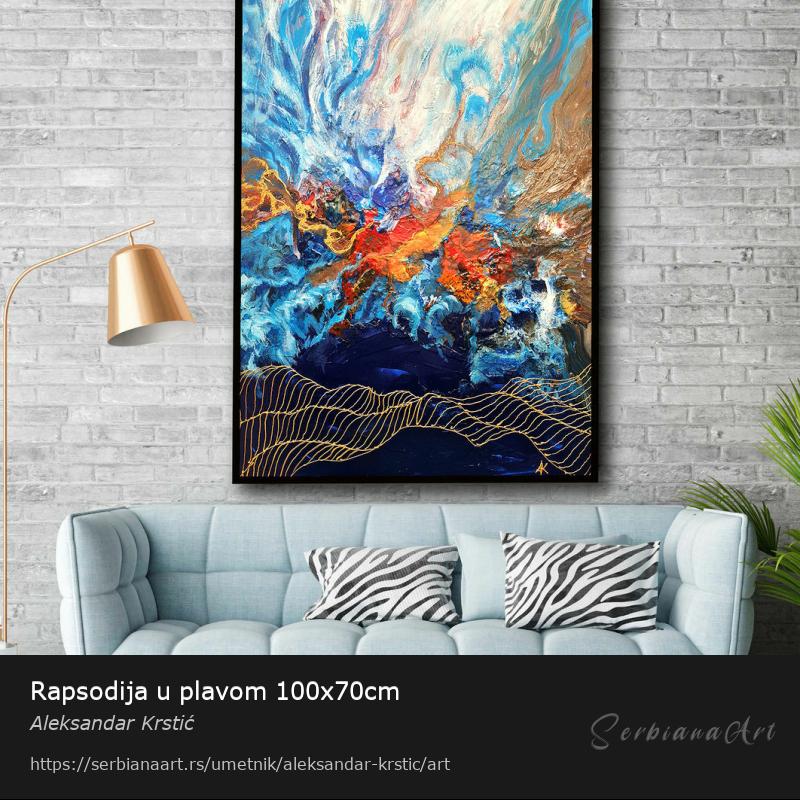 Rapsody in blue 100x70cm. Kombinovana tehnika akrilnim bojama sa zlatnim detaljima koji daju slici eleganciju i luksuznu notu.Podelite i promovišite ovo delo