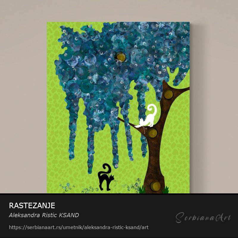 "Istezanje" prikazuje miran trenutak bele i crne mace koje se istežu ispred svog doma, uživajući u prirodnom okruženju. Mace u pozi istezanja simbolizuje važnost fleksibilnosti, ne samo u telu, već i u životu. Kao što istezanje poboljšava fizički pokret, ono predstavlja snagu prilagodljivosti, rasta i otpornosti u suočavanju sa životnim izazovima. Ovaj trenutak podseća nas na praksu joge, koja nas uči da, kao i naše telo, i naš um treba da bude fleksibilan i otvoren za promene.
