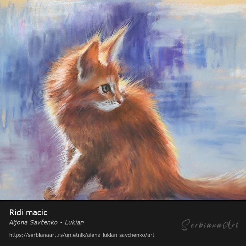 Ova umetnička slika pastelom prikazuje riđeg mačića sa nežnim, pahuljastim krznom koje reflektuje toplu svetlost. Njegov znatiželjni pogled i opuštena poza unose osećaj topline i radosti. Mekane linije i bogate nijanse pastela stvaraju dubinu i prirodnost prizora, dok detalji krzna i izraza lica dodaju posebnu čar. Ova slika idealno oslikava nežnost i lepotu trenutka u kojem se priroda i umetnost stapaju.