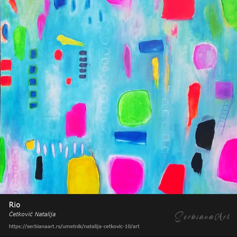 Apstraktna slika "RIO", jakih, efektnih boja, Akrilne boje na platnu, na blind ramu. 80x100 cm. Izuzetno efektna.