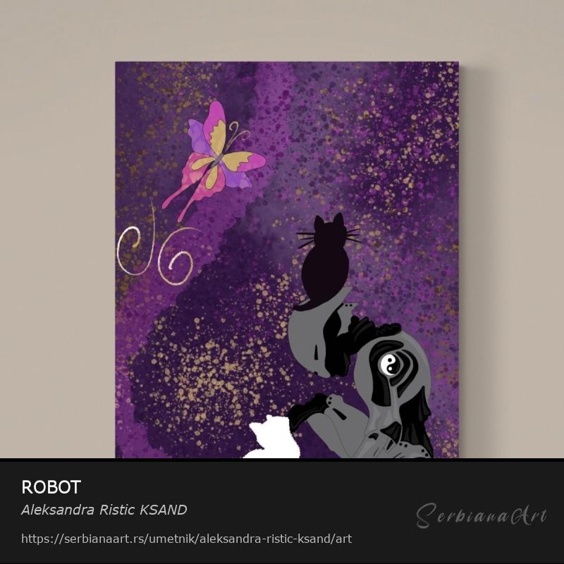 "Robot" je snažna i simbolična slika koja odražava put transformacije i samootkrivanja. U njenom središtu je simbol jin-jang, oličen kroz crnu i belu mačku — prikaz ravnoteže, dualnosti i života koji one donose u svet umetnika. Njihovo prisustvo donosi harmoniju i smisao, čineći ih dušom ove vizije.