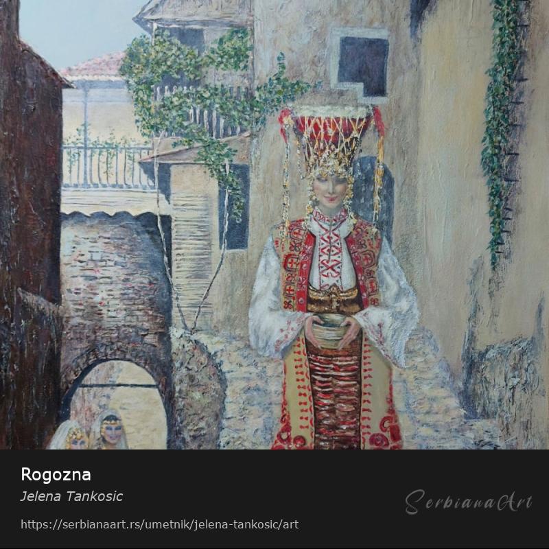 Nevesta u nošnji Rogozne, Raška oblast. Oglavlje joj je sačinjeno od vezica, prstenova i dukata. Obučena je u svečanu odeću tog vremena, ručno izvezenu, tako da simbolizuje njenu etničku pripadnost. U rukama drži sito, za koje se verovalo da donosi plodnost i napredak.Podelite i promovišite ovo delo