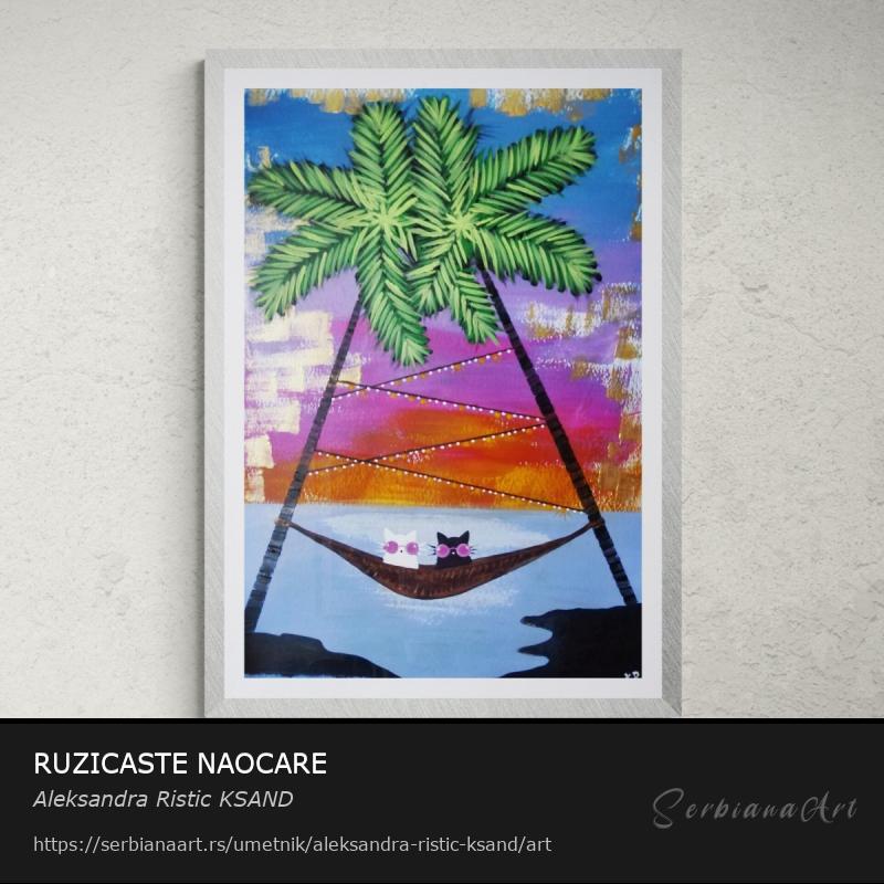 "Ružičaste naočare" odišu letnjom energijom i pozitivnošću, prikazujući crnu i belu mačku koje nose razigrane ružičaste naočare u živopisnom prizoru sa dve njišuće palme. Topla, osunčana atmosfera dočarava suštinu bezbrižnih dana i radosnih trenutaka.
