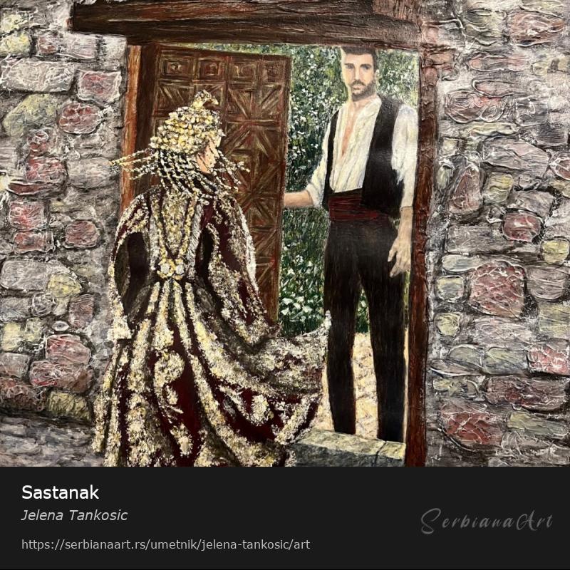 Nevesta u tradicionalnoj odeći carskog grada Prizrena. Oglavlje joj je sačinjeno od zlatnih dukata i niski lančića i obučena je u nošnju ručno izvezenu zlatnom srmom. Sam vez simbolizuje njenu etničku pripadnost. Muškarac je u srpskoj nošnji, takođe. Na slici je uočljiv delić stare arhitekture, ograda izgrađena od prirodnog kamena I drvena kapija.Podelite i promovišite ovo delo