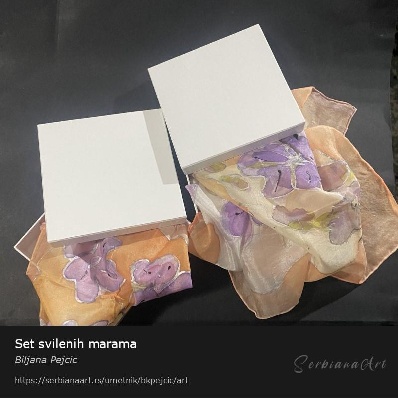 Set svilenih marama dimenzija 52x52cm i 28x28 cm, su elegantne svile marame s apstraktnim floralnim motivima, gde kombinacija mekih i živopisnih boja, tekućih linija i oblika evocira prirodu cvetova, ali na suptilan i stilizovan način. Ručno su oslikane specijalnim bojama i alajnerima.Ivice su ručno obrubljene. Pakovane su u svojim kutijama.