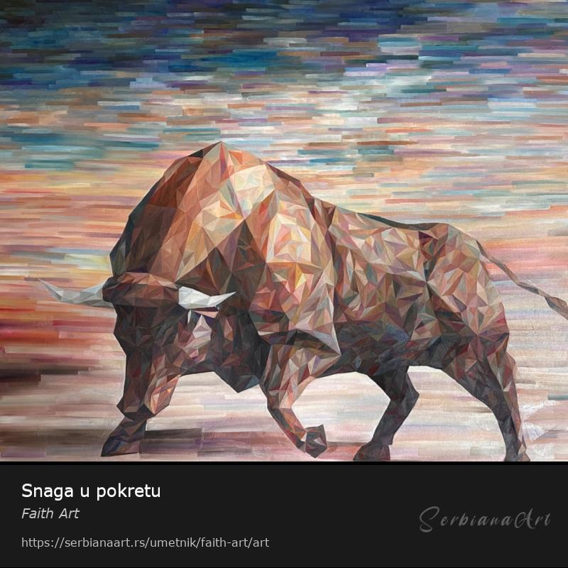 Ova slika prikazuje bika u trenutku unutrašnje napetosti i snage, neposredno pre eksplozije pokreta. Izrađen u savremenom low poly stilu, bik je oblikovan kroz niz trodimenzionalnih formi i preliva boja koji dodatno naglašavaju njegovu snagu, masu i karakter. Svaka oštra linija i prelaz nosi ritam, pokret i napetost — kao da je sam bik sklopljen od energije.