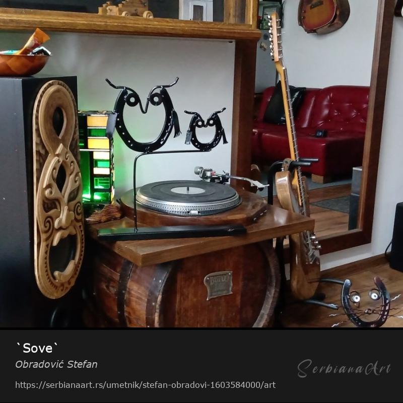``Sove`` skulptura dve sove od potkovica i drugih metalnih delova koji su ofarbani bojom za metal. Zainteresovani kupac može naručiti sličnu skulpturu ``Sove`` pošto je ova prodata.Podelite i promovišite ovo delo