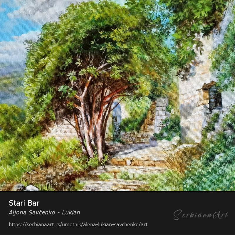 Ova umetnička slika prikazuje letnji pejzaž Starog Bara u Crnoj Gori, oslikan živopisnim bojama koje dočaravaju toplinu mediteranskog leta. Kamenite zidine starog grada, okružene bujnim zelenilom i plavetnilom neba, prenose osećaj mira i vanvremenske lepote. Pažljivo oslikani detalji arhitekture i prirode stvaraju harmoničnu kompoziciju koja odražava bogatu istoriju i autentičan duh ovog mesta. Slika poziva posmatrača na putovanje kroz vreme i prirodu.