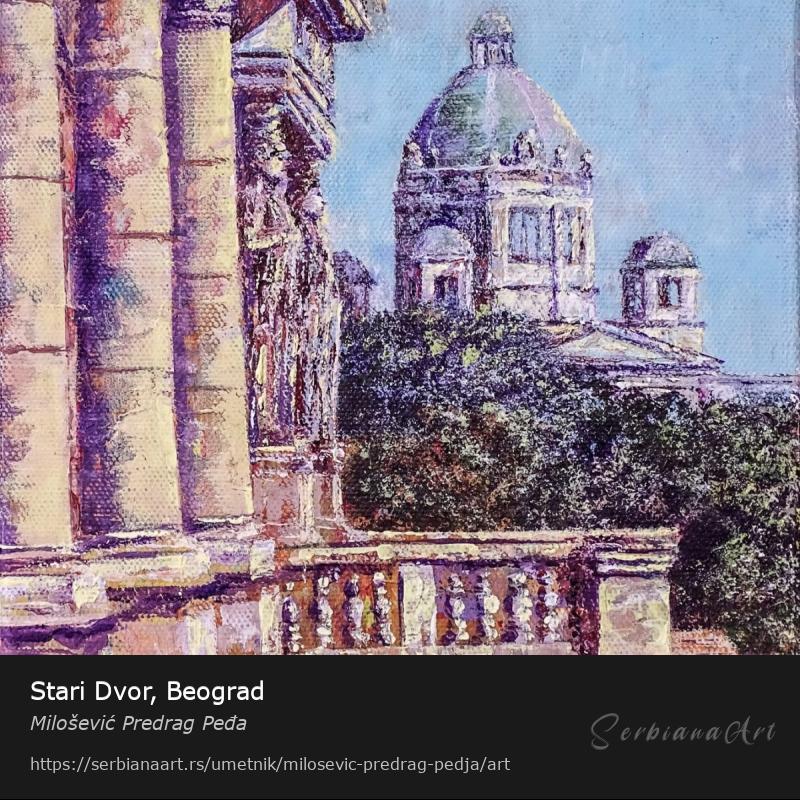Istorijsko-romantični fragment zdanja Stari Dvor u Beogradu. Pogled sa terase Dvora na Skupštinu Srbije i gradski park. Prikazuje lepotu i toplinu stare arhitekture i smiraj zelenila parka.