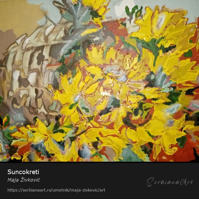 Suncokreti su moje omiljeno cveće koje su uvek inspiracija za sve lepo i jedinestveno pa nisam ogla odoleti da ih ne nasikam. Inače, moje prvo delo Akrilne boje na ulju, ulje razapeto na unutrašnjem ramu.