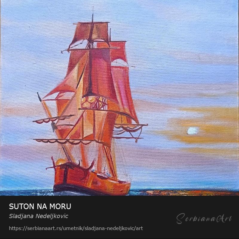 SUTON na moru je slika za tvoj prostor ako voliš more, zalazak Sunca, brodove, jedra i tople tonove leta...