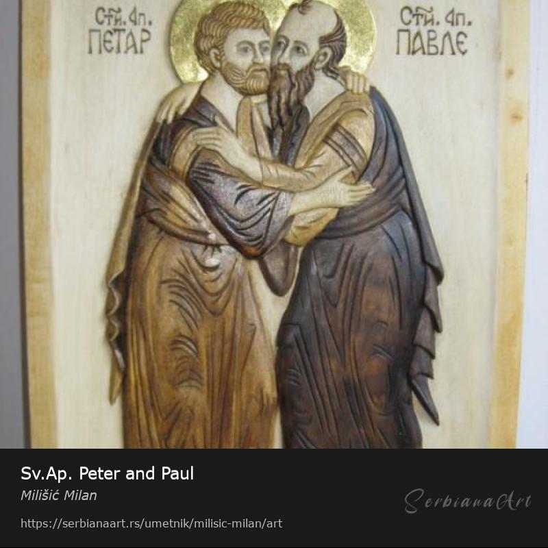 Korišten materijal za izradu: drvo topola, pozlata na oreolima 23 karatno zlato, za toniranje orahov bajc i šelak.Podelite i promovišite ovo delo