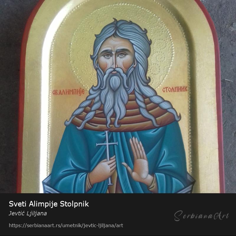 SVETI ALIMPIJE STOL0PNIK, dimenzije 20X30cm, pigmenti na lipovoj dasci, pozlata 23,75 karata, oreol sa reljefnom ornamentikom 22,5 karata.Podelite i promovišite ovo delo