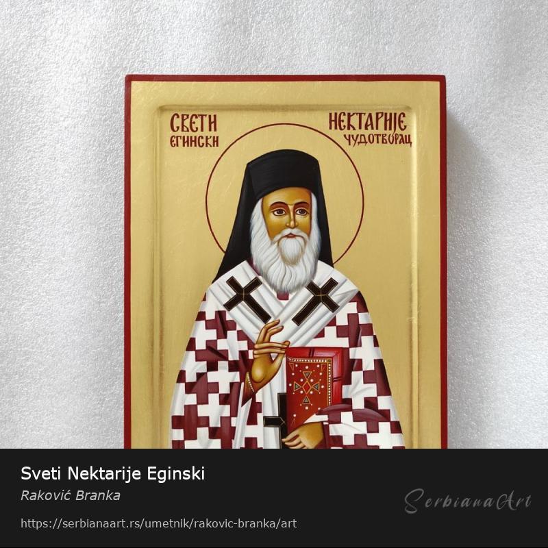 Ikona Sveti Nektarije,format 20x26.,lipova daska. Tehnika jajčana tempera,pozlata šlag metal. Autorski rad Kontakt br.: 064/191-45-91 web stranica: www.brankaikone.com