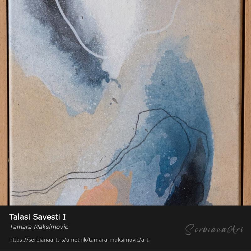 Akril i kombinovane tehnike na sirovom platnu. Uramljeno u bukovo drvo.