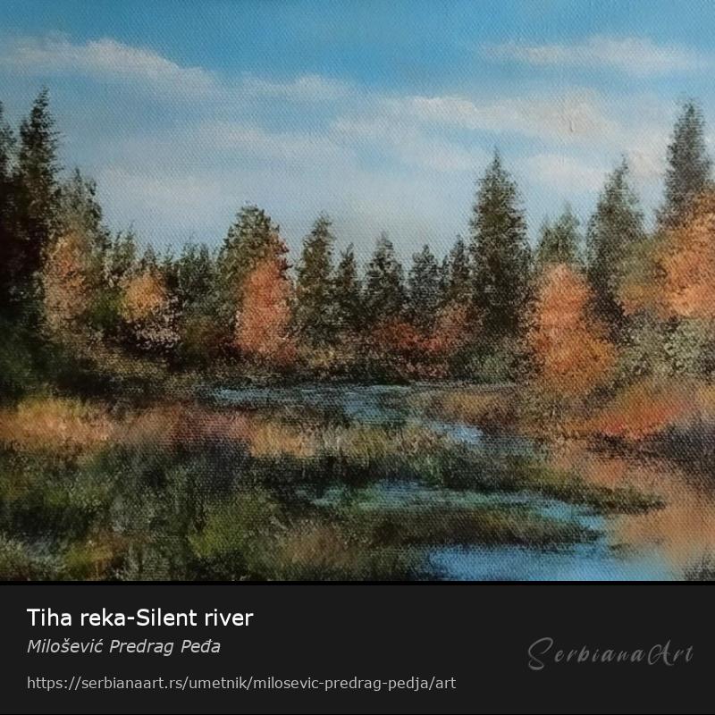 Na slici je prikazana mala rečica koja vijuga kroz šareni jesenji pejzaž. Obale su obavijene toplim tonovima žutog, narandžastog i crvenog lišća. Površina vode nežno odražava bistro nebo iznad. Cela scena odiše toplinom, spokojem i lepotom jeseni u prirodi.