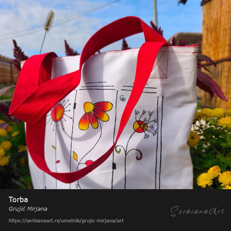 Torba šivena-ručni rad.Prednji deo od pamučnog platna a sve ostalo od šoteksa(nepromočiv materijal od kog se šiju lazy begovi-izuzetno čvrst materijal).Sa prednje strane oslikana bojama za tekstil koje se ne ispiraju pri pranju i vrlo su postojane.