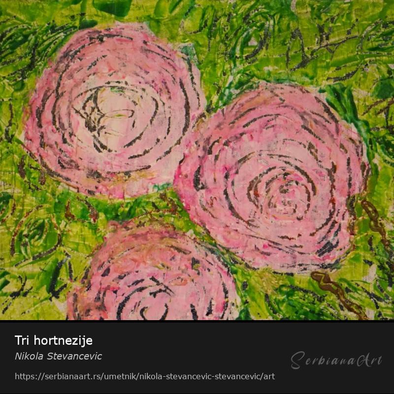 Ova slika hvata nežnu suštinu tihe poezije prirode. Tri apstraktna cveta, prikazana u teksturiranim nijansama ružičaste boje, živo se pojavljuju na živopisnoj zelenoj pozadini. Spiralni potezi sugerišu i kretanje i mir - poput latica uhvaćenih blagim povetarcem. Ova slika slavi obnovu, mekoću i bezvremensku lepotu cveća osmišljenu kroz ekspresivnu apstrakciju.