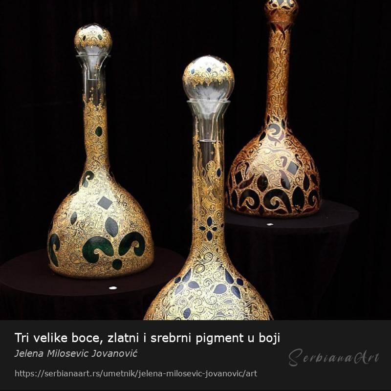 Tri velike boce, visina boce 80cm, rucno duvano i slikano staklo, zlatni i srebrni pigment u boji.Podelite i promovišite ovo delo