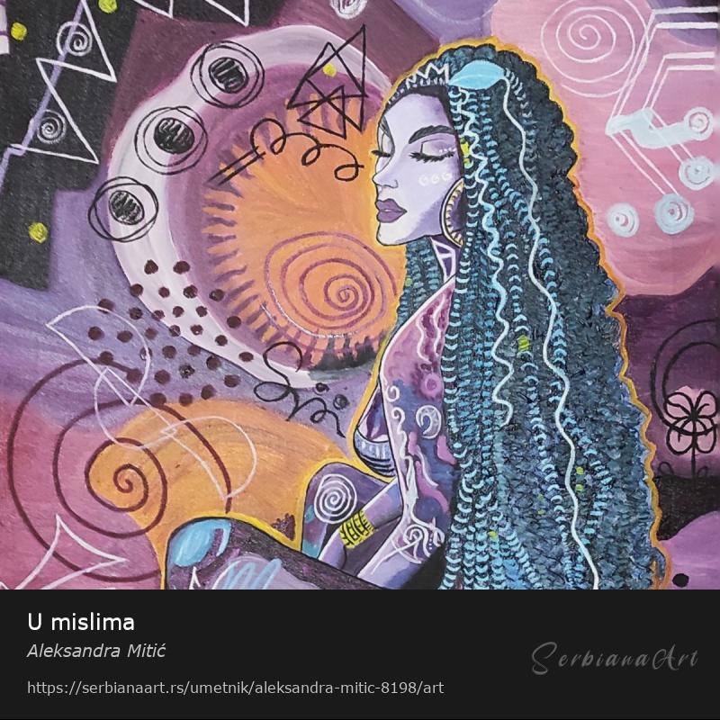 Slika prikazuje ženu u meditativnom položaju, okruženu simbolima koji predstavljaju energiju, misli i unutrašnji mir. Bogata paleta ljubičastih i narandžastih tonova stvara snažan vizuelni doživljaj i mističnu atmosferu. Delo odiše duhovnošću, introspekcijom i harmonijom.