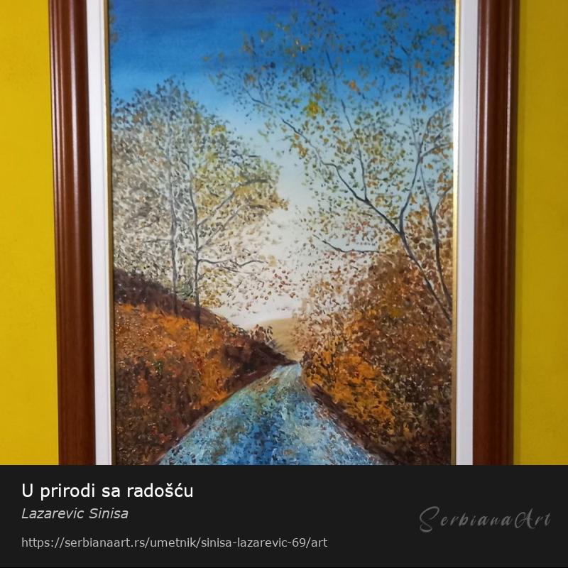 Na slici"U prirodi sa radošću"vidimo slikovitu reku koja teče kroz šumu.Plava boja reke u kontrastu sa smedjim tonovima šume stvara mirnu i prijatnu atmosferu.Čini se da se voda polako kreće,dok se krošnje drveća ljuljaju na blagom povetarcu.Sve to stvara osećaj opuštenosti i radosti,kao da se nalazimo u središtu prirode.Original slika sa potpisom