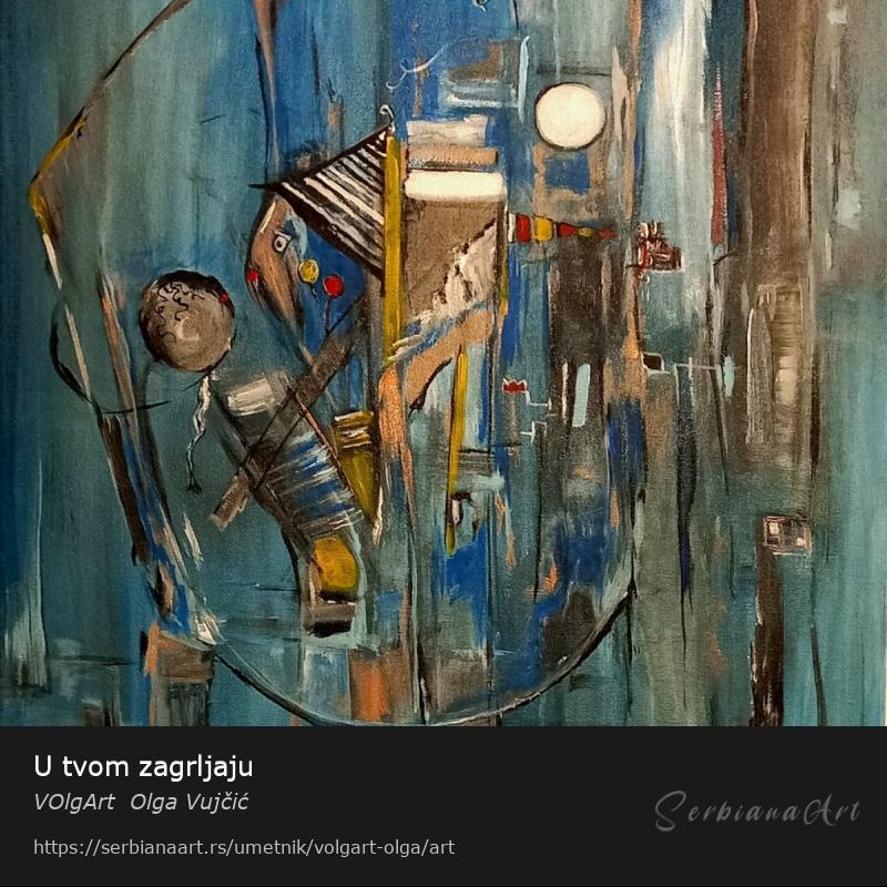 Umetničko delo "U tvom zagrljaju" odiše apstrakcijom, gde plava boja i nijanse plave formiraju atmosferu intimnosti. Ova slika, prepoznatljiva po apstraktnom prikazu, sugeriše na dvoje ljubavnika zagrljenih na pučini, dok mesečina u pozadini dodatno naglašava romantiku trenutka. Kroz svoju plavu paletu, prenosim osećaj ljubavi i povezanosti, istražujući emocionalne dubine kroz vizuelnu apstrakciju.