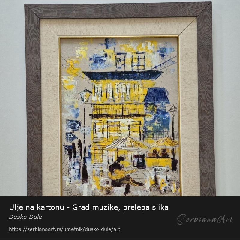 Ulje na kartonu Grad muzike, prelepo umetnicko delo. Slika je uramljena u jako lep ram, dimenzije slike sa ramom 48 x 38. Privatna kolekcija.