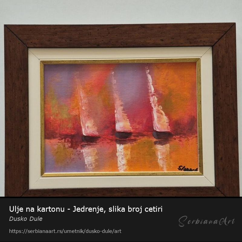 Ulje na kartonu Jedrenje, slika broj cetiri. Prelepo umetnicko delo. Slika je uramljena u jako lep ram, dimenzije slike sa ramom 36 x 29. Privatna kolekcija.