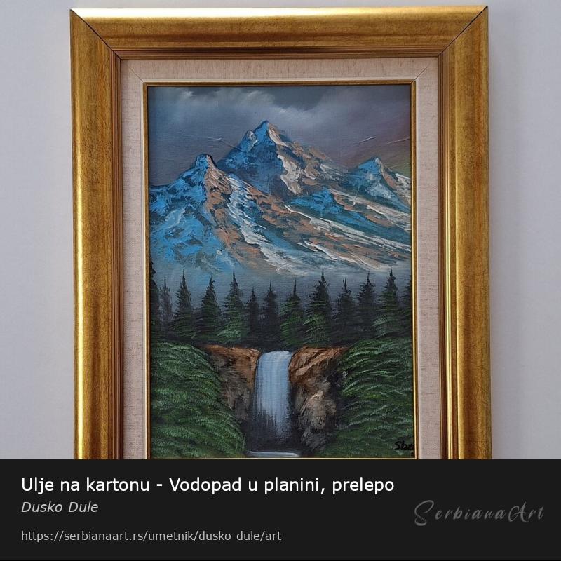 Ulje na kartonu Vodopad u planini, prelepo umetnicko delo. Slika je uramljena u jako lep ram, dimenzije slike sa ramom 45 x 35. Privatna kolekcija.