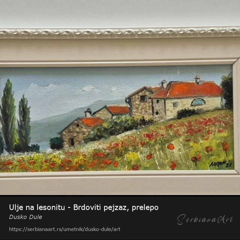 Ulje na lesonitu Brdoviti pejzaz, prelepo umetnicko delo. Slika je uramljena u jako lep ram, dimenzije slike sa ramom 44 x 26. Privatna kolekcija.