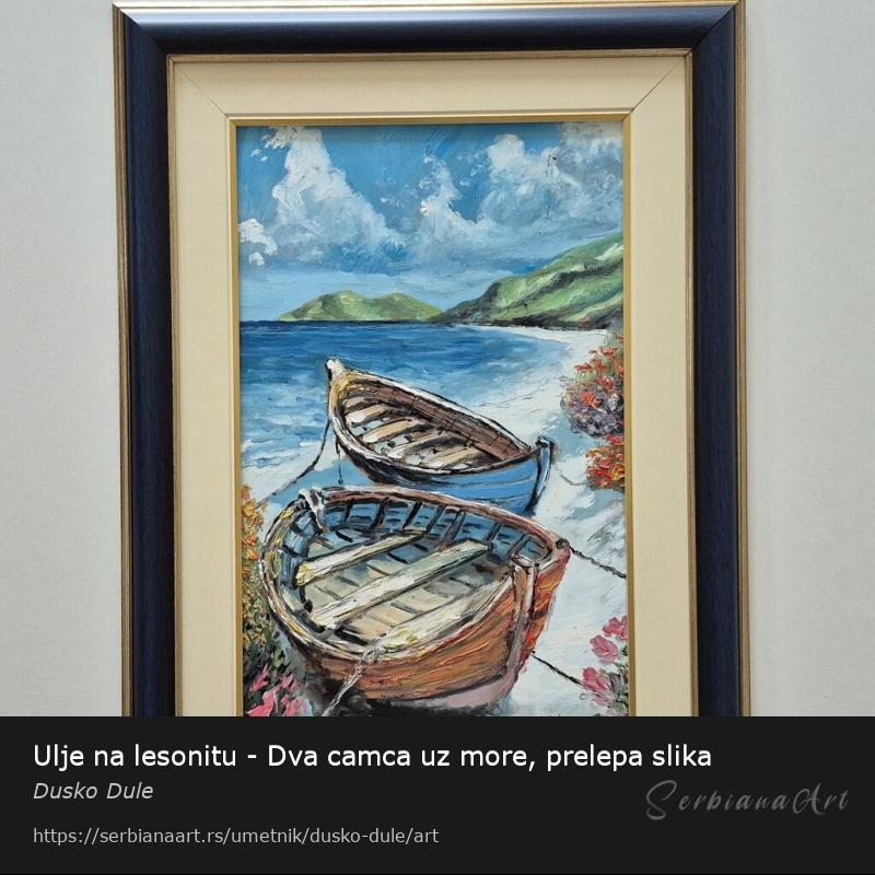 Ulje na lesonitu Dva camca uz more, prelepo umetnicko delo. Slika je uramljena u jako lep ram, dimenzije slike sa ramom 54 x 39. Privatna kolekcija.