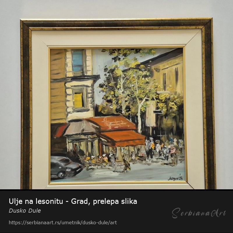 Ulje na lesonitu Grad, prelepo umetnicko delo. Slika je uramljena u jako lep ram, dimenzije slike sa ramom 40 x 40. Privatna kolekcija.
