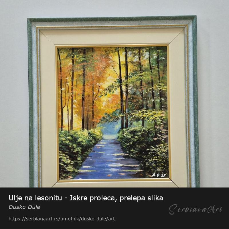Ulje na lesonitu Iskre proleca, prelepo umetnicko delo. Slika je uramljena u jako lep ram, dimenzije slike sa ramom 42 x 37. Privatna kolekcija.