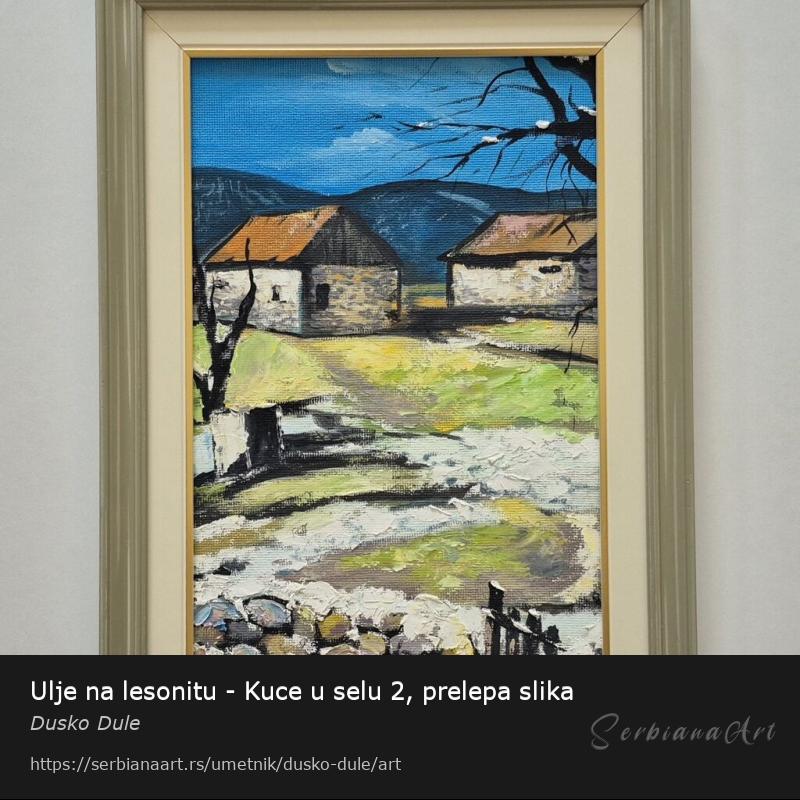 Ulje na platnu Kuce u selu 2, prelepo umetnicko delo. Slika je uramljena u jako lep ram, dimenzije slike sa ramom 50 x 35. Privatna kolekcija.