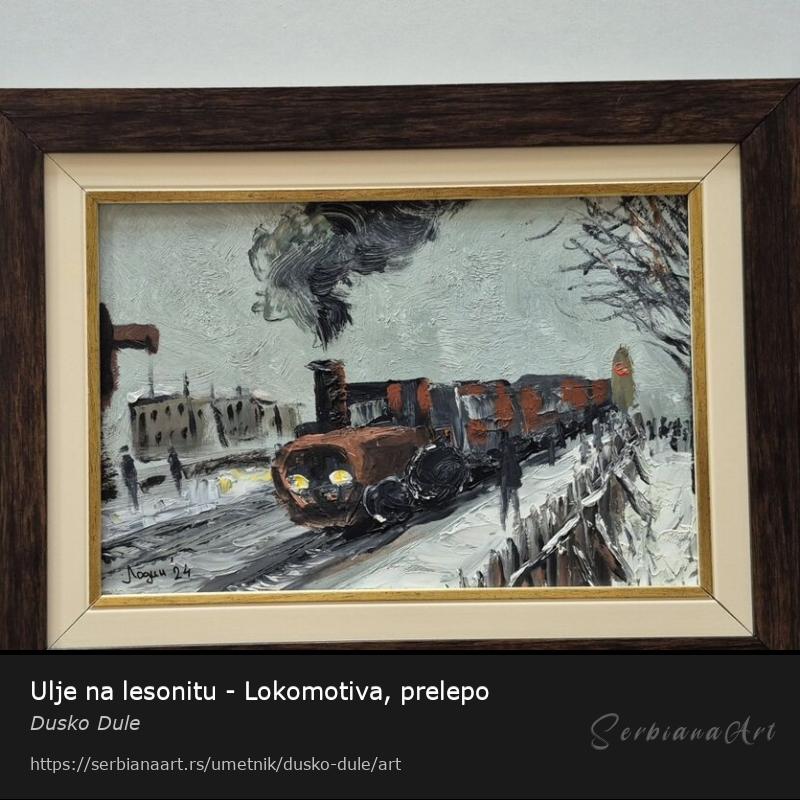 Ulje na lesonitu Lokomotiva, prelepo umetnicko delo. Slika je uramljena u jako lep ram, dimenzije slike sa ramom 40 x 30. Privatna kolekcija.