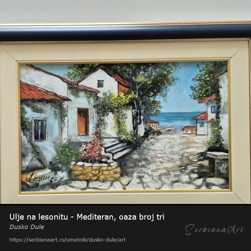 Ulje na lesonitu Mediteran, oaza broj tri. Prelepo umetnicko delo. Slika je uramljena u jako lep ram, dimenzije slike sa ramom 54 x 39. Privatna kolekcija.