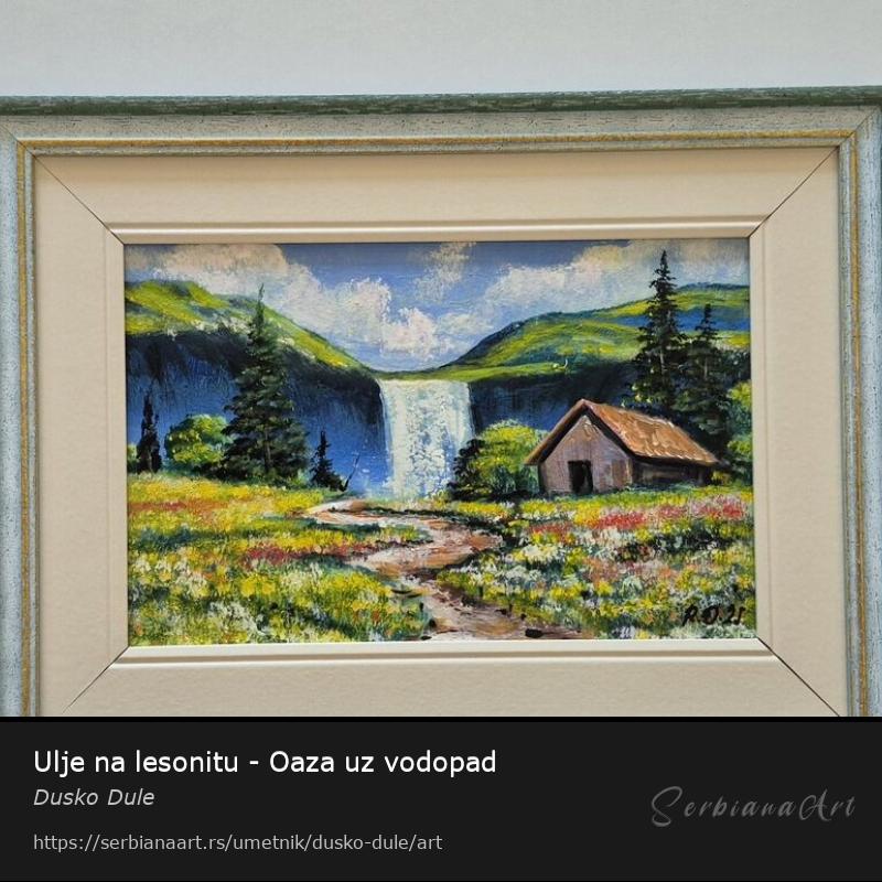Ulje na lesonitu Oaza uz vodopad, prelepo umetnicko delo. Slika je uramljena u jako lep ram, dimenzije slike sa ramom 40 x 30. Privatna kolekcija.