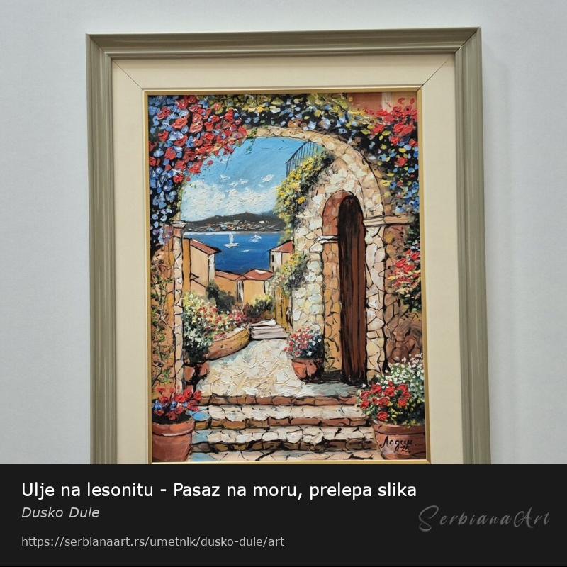 Ulje na lesonitu Pasaz na moru, prelepo umetnicko delo. Slika je uramljena u jako lep ram, dimenzije slike sa ramom 52 x 42. Privatna kolekcija.