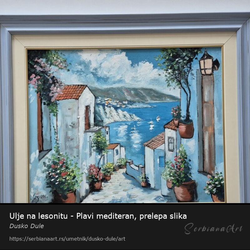 Ulje na lesonitu Plavi mediteran, prelepo umetnicko delo. Slika je uramljena u jako lep ram, dimenzije slike sa ramom 66 x 56. Privatna kolekcija.