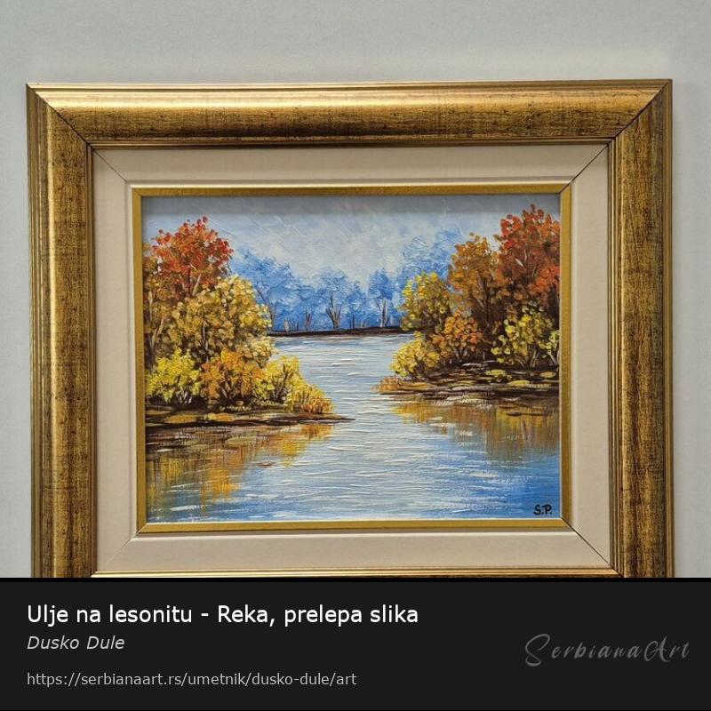Ulje na lesonitu Reka, prelepo umetnicko delo. Slika je uramljena u jako lep ram, dimenzije slike sa ramom 37 x 32. Privatna kolekcija.