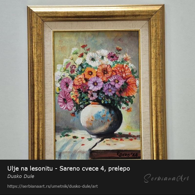 Ulje na lesonitu Sareno cvece 4, prelepo umetnicko delo. Slika je uramljena u jako lep ram, dimenzije slike sa ramom 42 x 32. Privatna kolekcija.