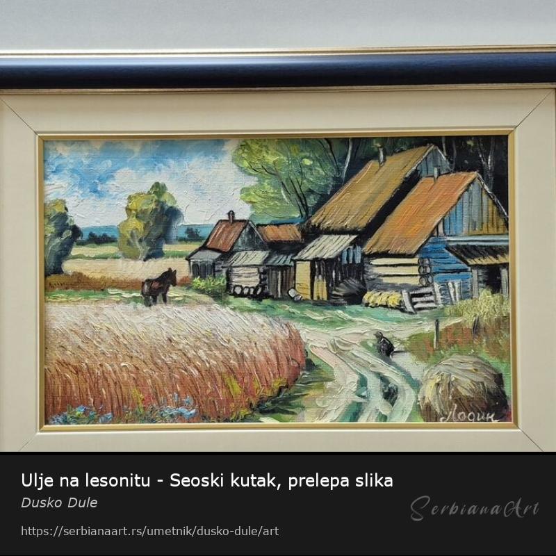 Ulje na lesonitu Seoski kutak, prelepo umetnicko delo. Slika je uramljena u jako lep ram, dimenzije slike sa ramom 55 x 39. Privatna kolekcija.