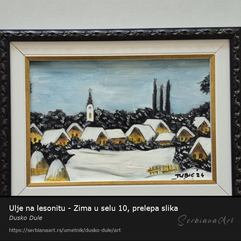 Ulje na lesonitu Zima u selu 10, prelepo umetnicko delo. Slika je uramljena u jako lep ram, dimenzije slike sa ramom 32 x 24. Privatna kolekcija.