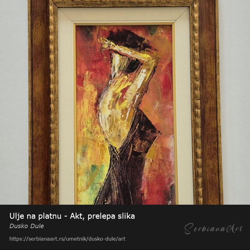 Ulje na platnu Akt, prelepo umetnicko delo. Slika je uramljena u jako lep ram, dimenzije slike sa ramom 45 x 30. Privatna kolekcija.